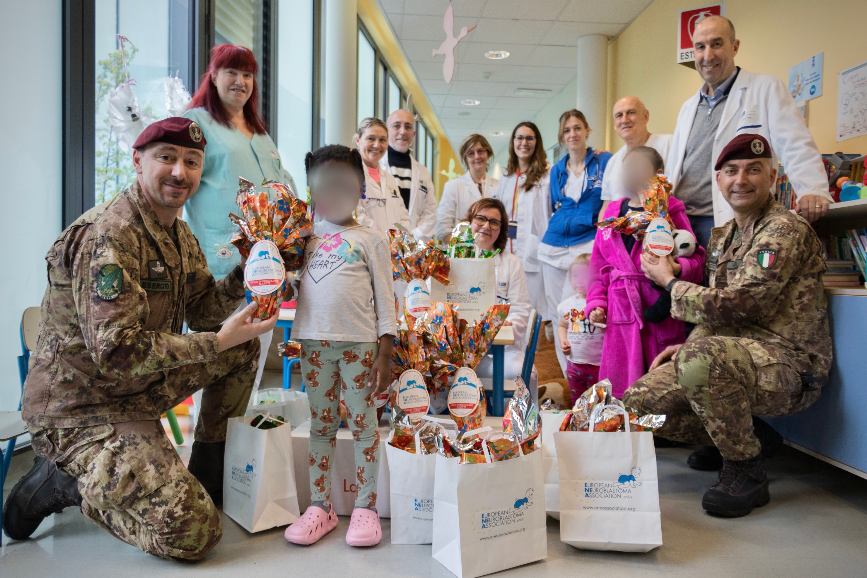 Prato - Il 183° Reggimento Paracadutisti Nembo ha voluto augurare buona Pasqua ai piccoli pazienti dei reparti di pediatria dell’ospedale Santo Stefano di Prato, portando loro in dono le tradizionali uova di cioccolato.
