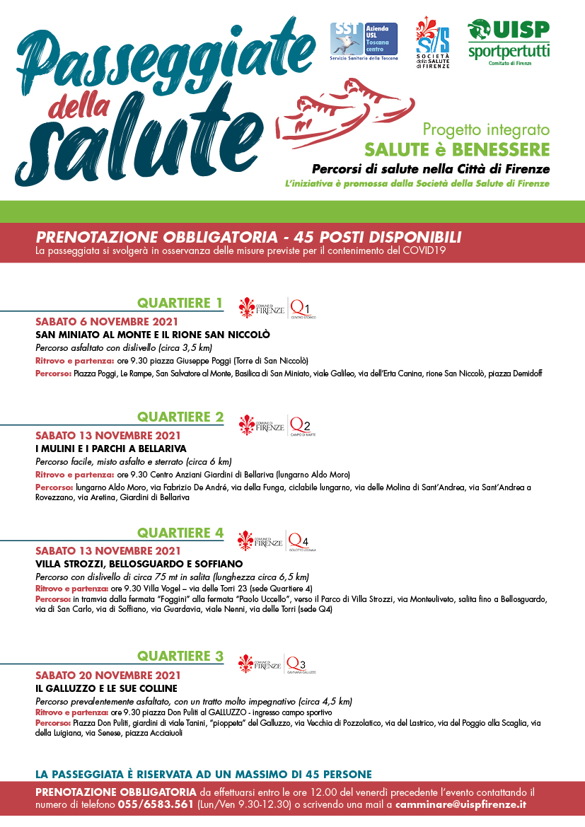 Si tratta di camminate alla riscoperta di tutte le bellezze della nostra città e a tutto vantaggio della salute e del benessere. Tornano le “Passeggiate della Salute”, promosse dalla Società della Salute di Firenze in collaborazione con l’Associazione UISP Comitato Firenze, per offrire ai cittadini un’occasione per un’attività motoria all’aperto unita alla visita di zone meno conosciute e frequentate dei 5 quartieri della città.
