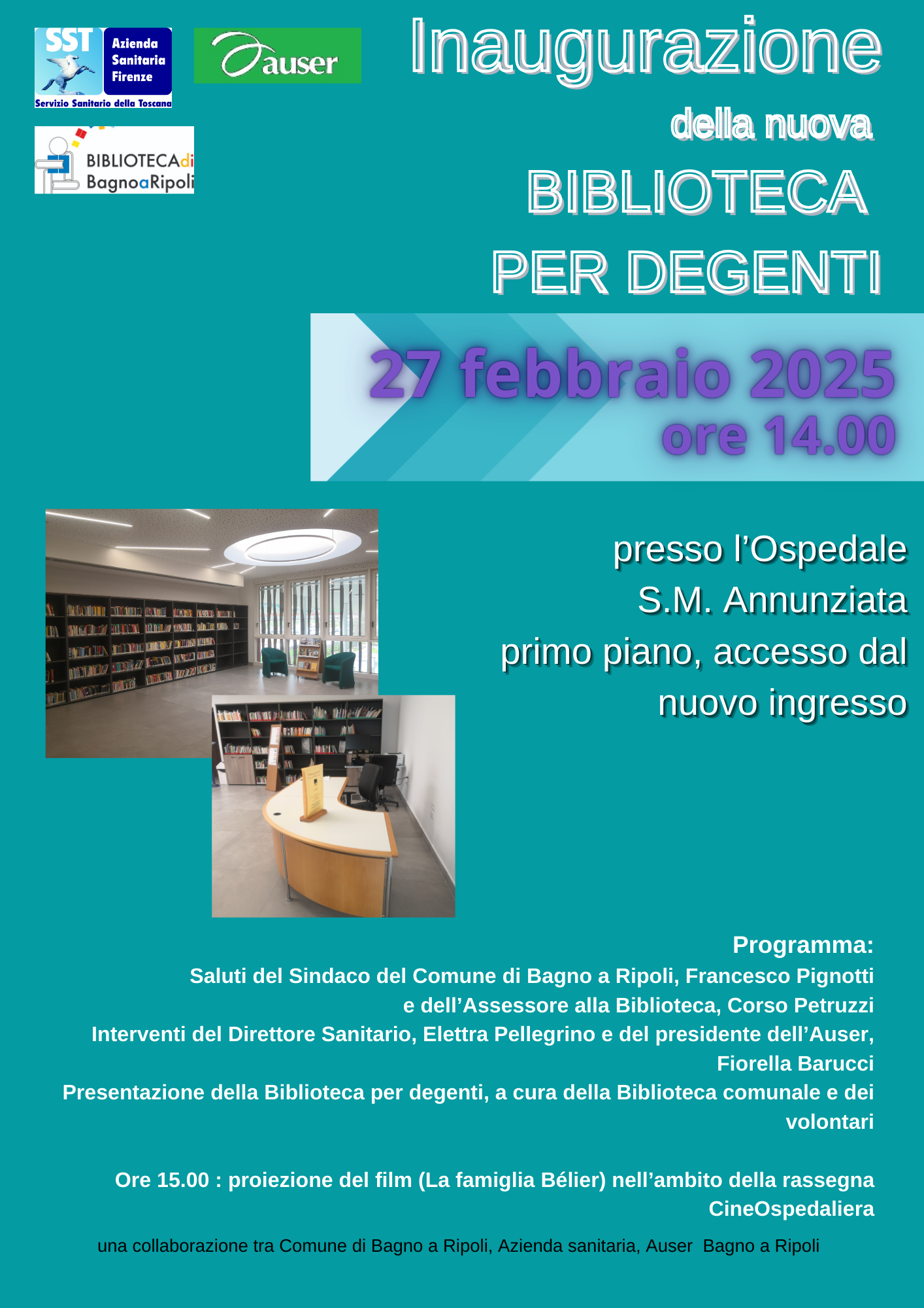 Firenze – L’ospedale Santa Maria Annunziata ha la sua “Biblioteca e Sala Lettura” dedicata a sanitari, pazienti, volontari e caregiver. Lo spazio, attiguo all’Auditorium, sarà inaugurato il 27 febbraio (alle 14) dalla Direttrice del Presidio Elettra Pellegrino, dal sindaco di Bagno a Ripoli, Francesco Pignotti, dall’Assessore alla biblioteca, Corso Petruzzi, e da Fiorella Barucci, Presidente Auser di Bagno a Ripoli, i tre soggetti istituzionali che insieme ai volontari del servizio “Un libro e un volontario per amico”, hanno collaborato alla realizzazione e all’allestimento della biblioteca ospedaliera.