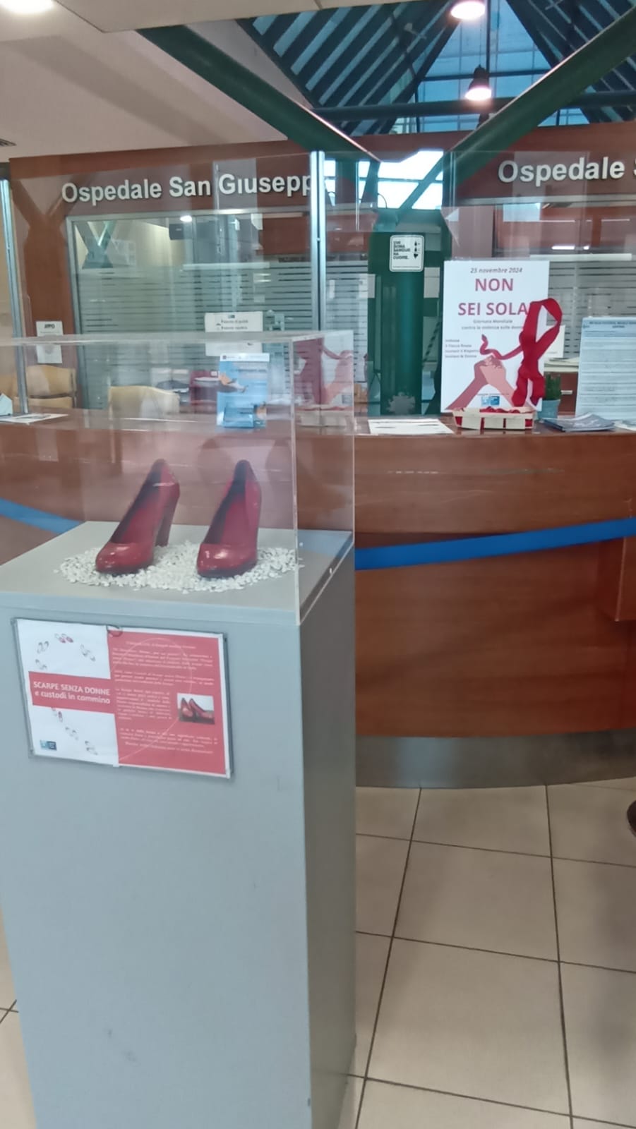 Come ogni anno nella bacheca all’ingresso davanti alla portineria, è stata posizionata una teca con un paio di scarpe rosse, simbolo delle vittime di femminicidio. Anche qui operatori e visitatori hanno trovato un cestino di fiocchi rossi da indossare.