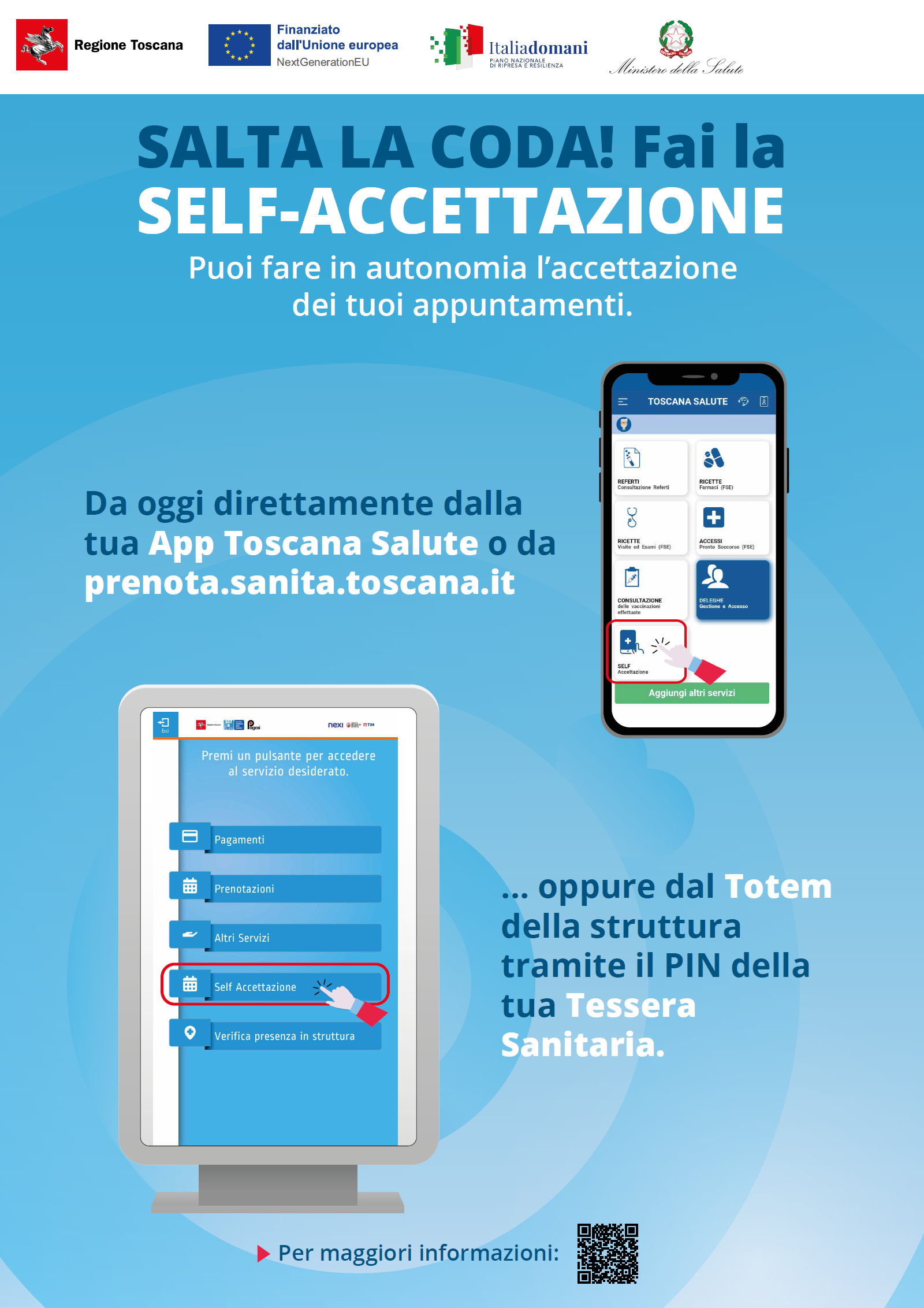 Nell’ambito territoriale fiorentino è possibile utilizzare la self accettazione all'ospedale Santa Maria Nuova di Firenze, in piazza Santa Maria Nuova 1, quindi sempre nel capoluogo toscano all'ospedale San Giovanni di Dio a Torregalli e poi ancora al Palagi, all’OSMA di Bagno a Ripoli, al Serristori di Figline e Incisa Valdarno quindi al nuovo ospedale del Mugello a Borgo San Lorenzo.
