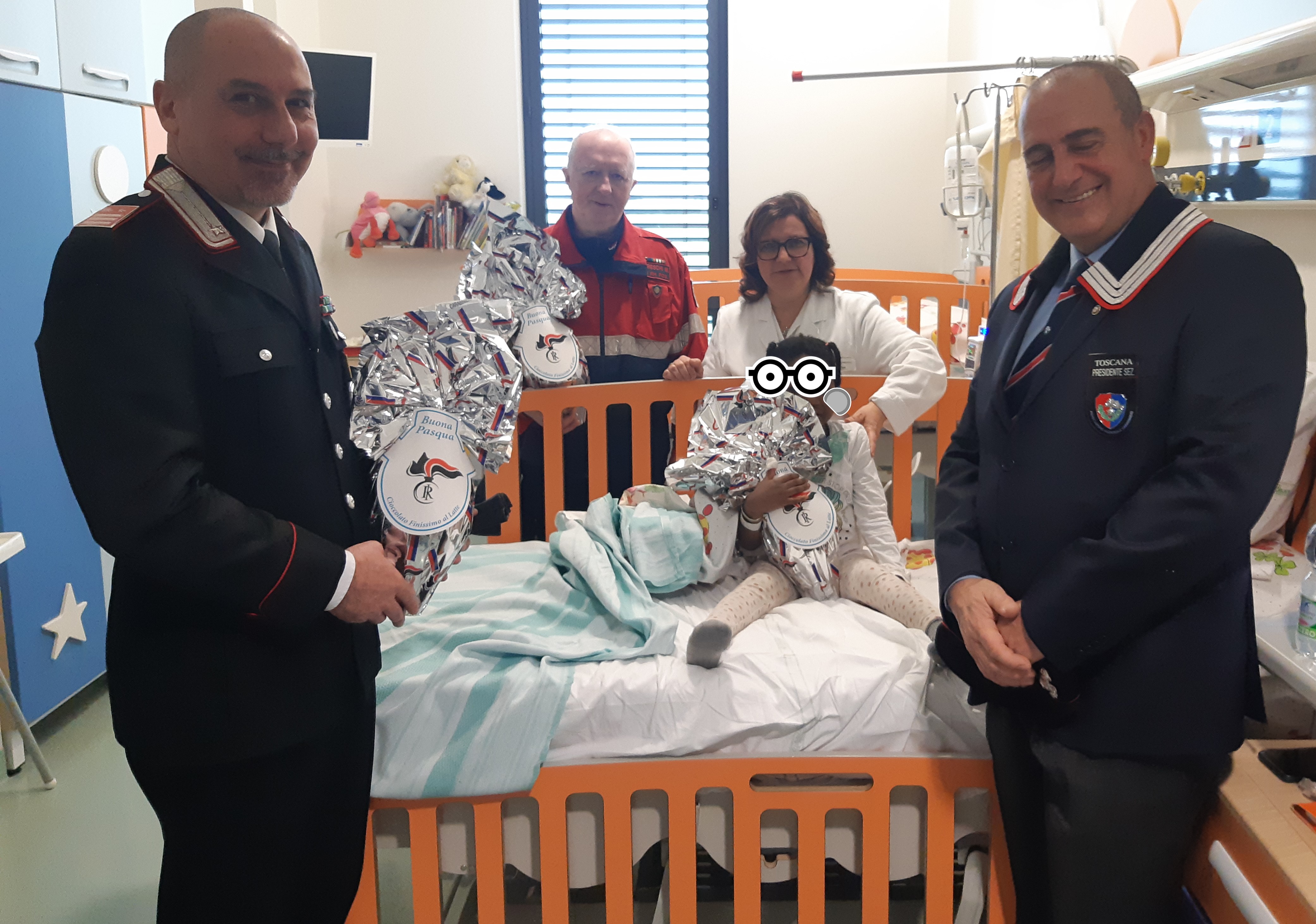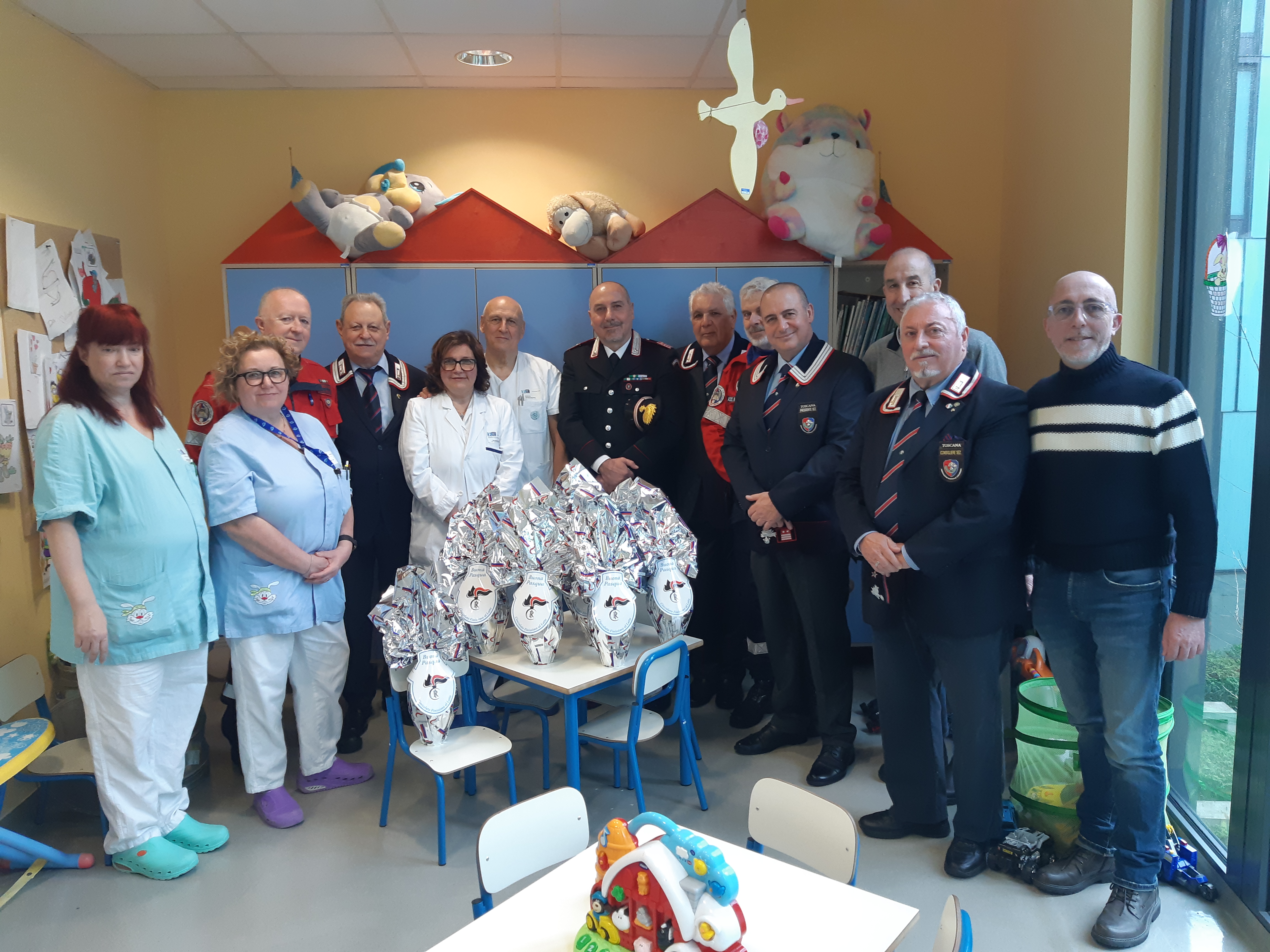 Pistoia  – Uova di Pasqua per i piccoli ricoverati del reparto pediatrico del San Jacopo sono state donate stamattina dall’Associazione nazionale Carabinieri, sezione pistoiese, insieme al Nucleo Volontariato Protezione Civile. Le uova di cioccolato sono state consegnate ai bambini dal presidente dell’Associazione Antonio Iadanza, dal Luogotenete comandate Carabinieri Stazione di Pistoia Nilo Angelo, insieme ai volontari e ai consiglieri della sezione.